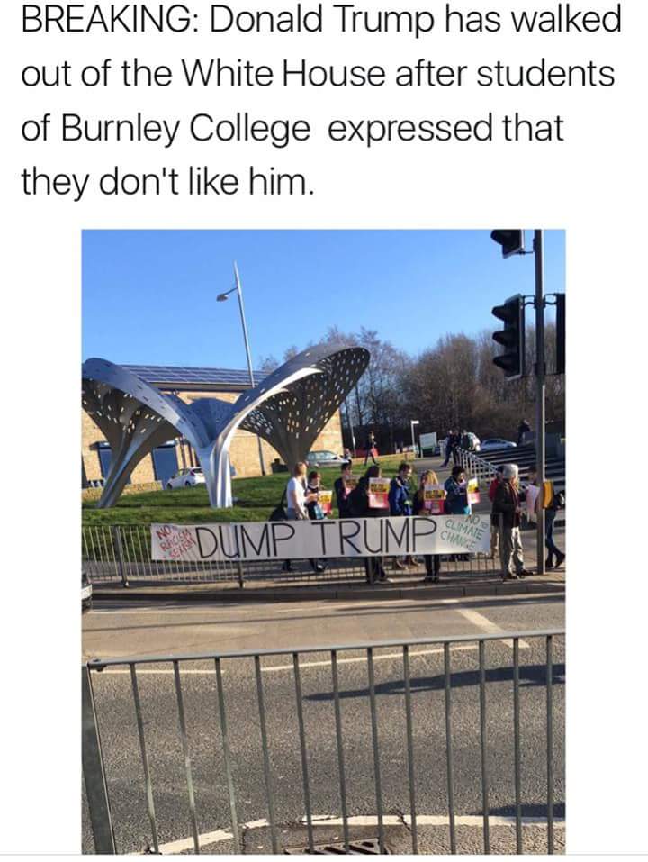 Now, on the face of it the caption is right. Trump isn't going to change any of his actions based off half a dozen students from a sixth form making a banner and holding some signs. He might never even hear of this protest. However, this small demonstration should not be mocked.